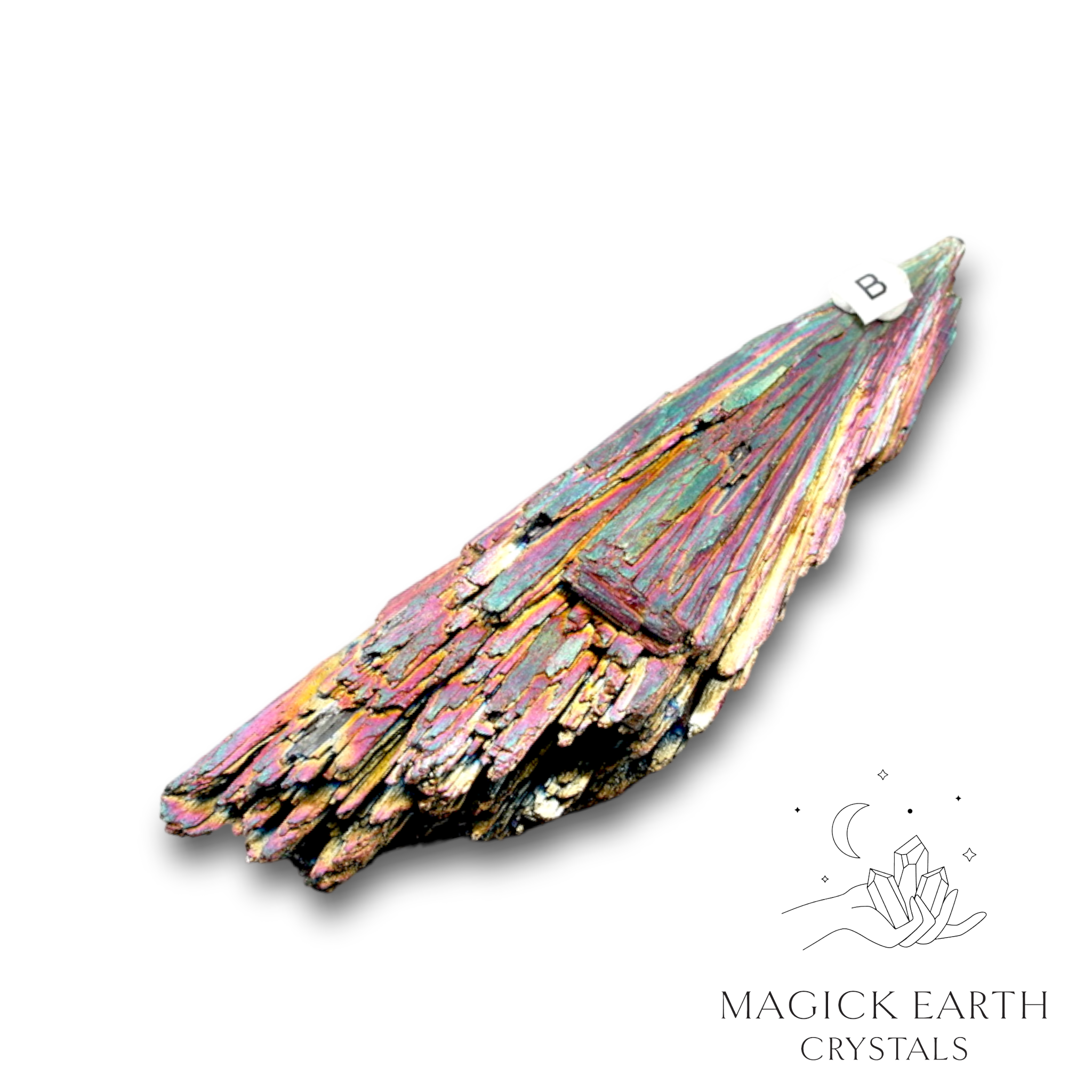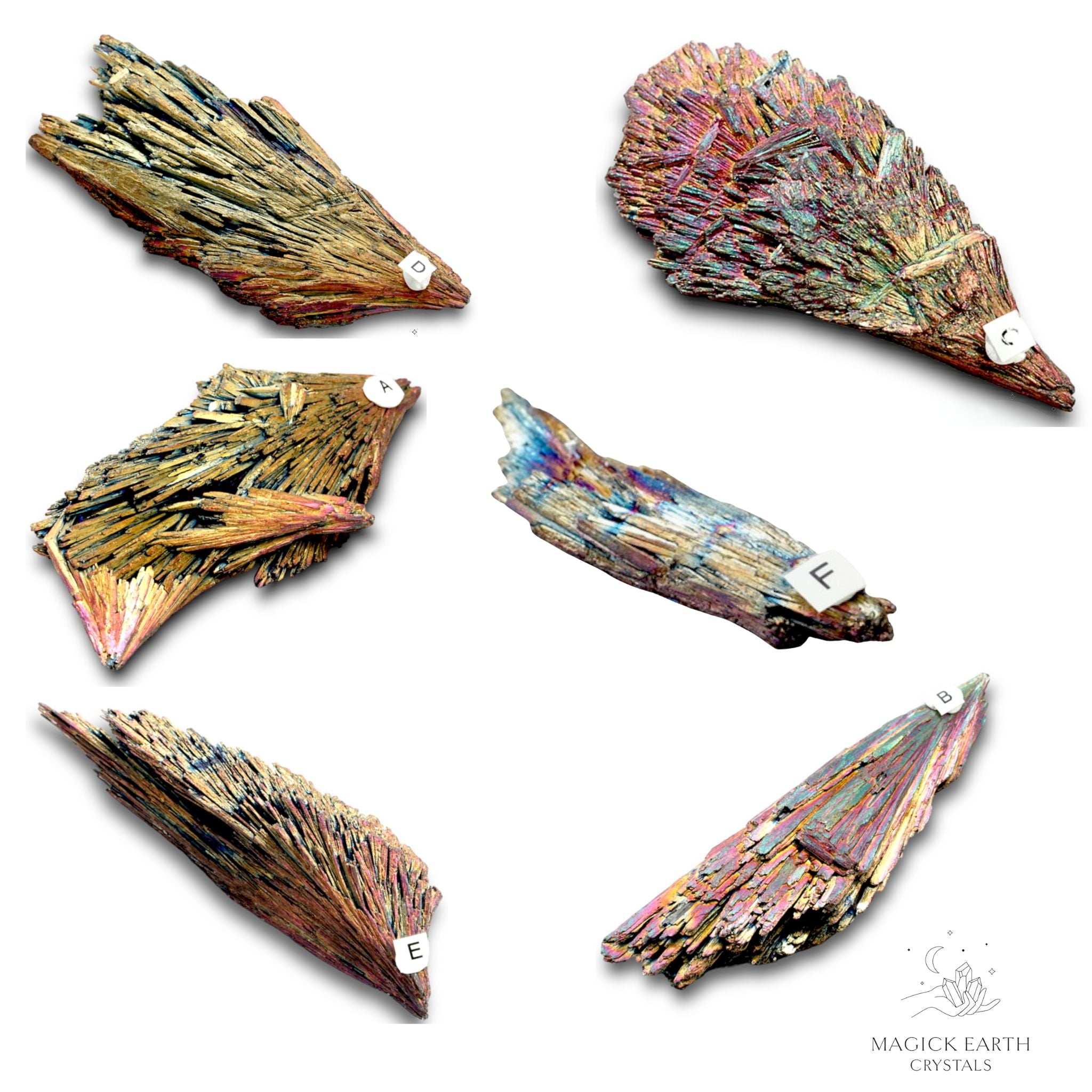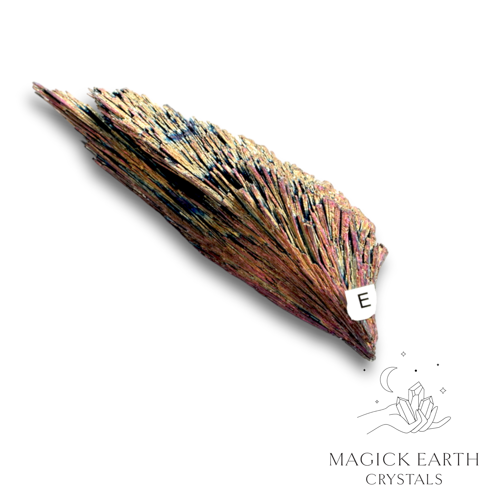 Electroplated Black Kyanite Fans combine the protective energy of kyanite with a bold metallic shimmer. Known for clearing negative energy and aligning the chakras, black kyanite is often used for cord cutting and energetic resets. The electroplated finish adds vibrant colour and makes each fan a striking piece for display, meditation, or energy work.