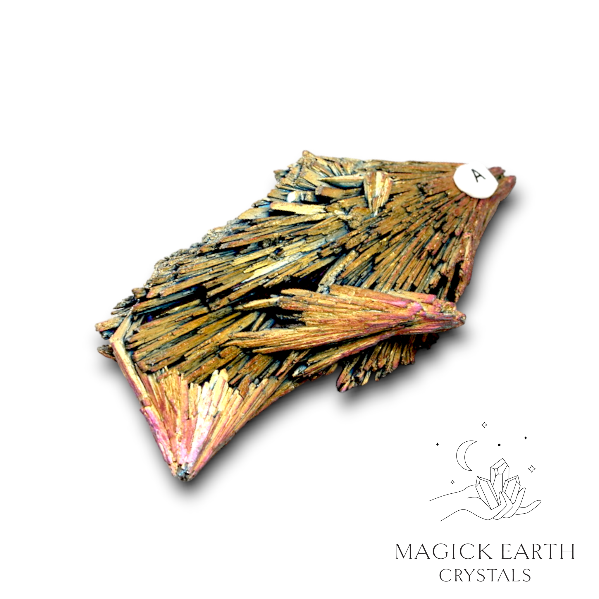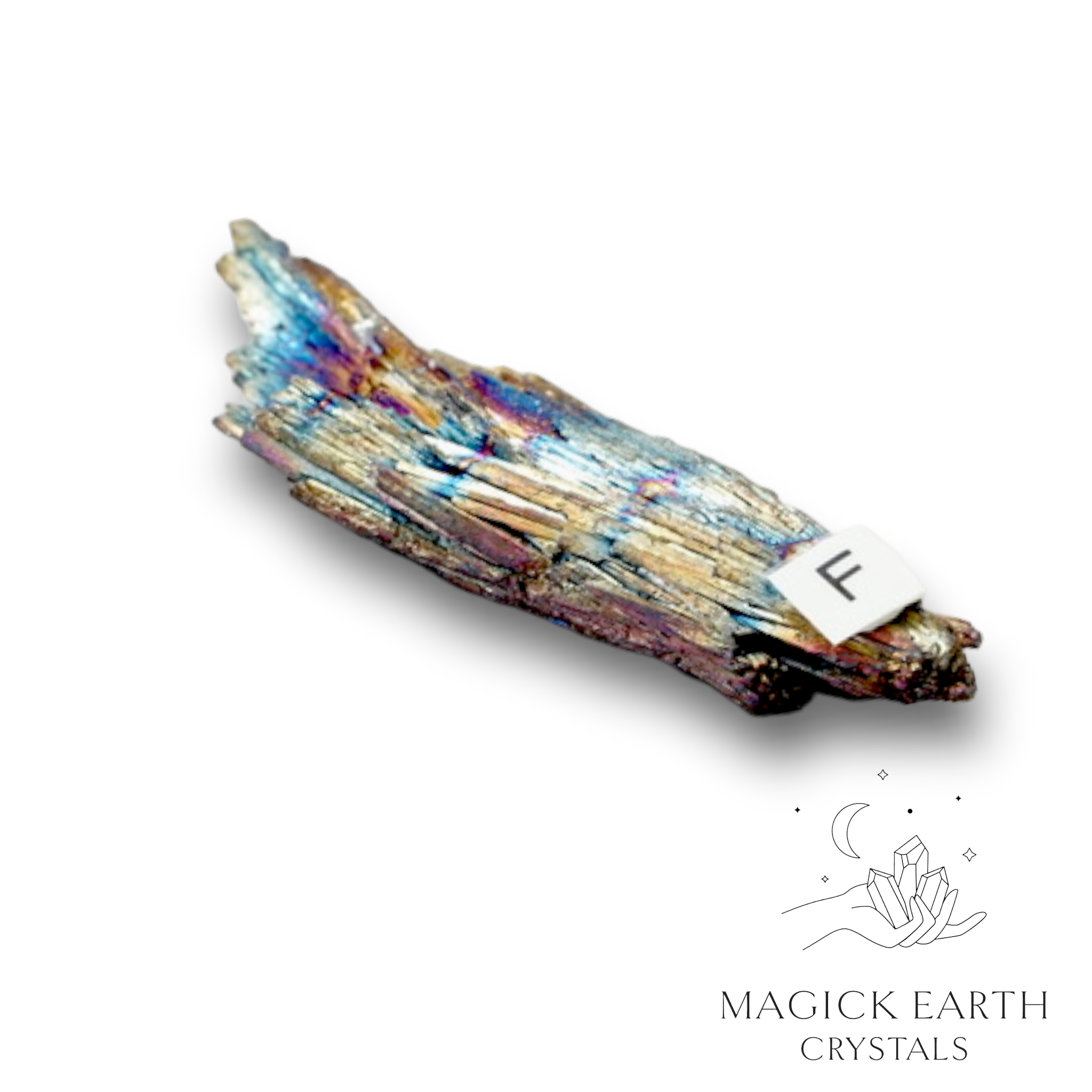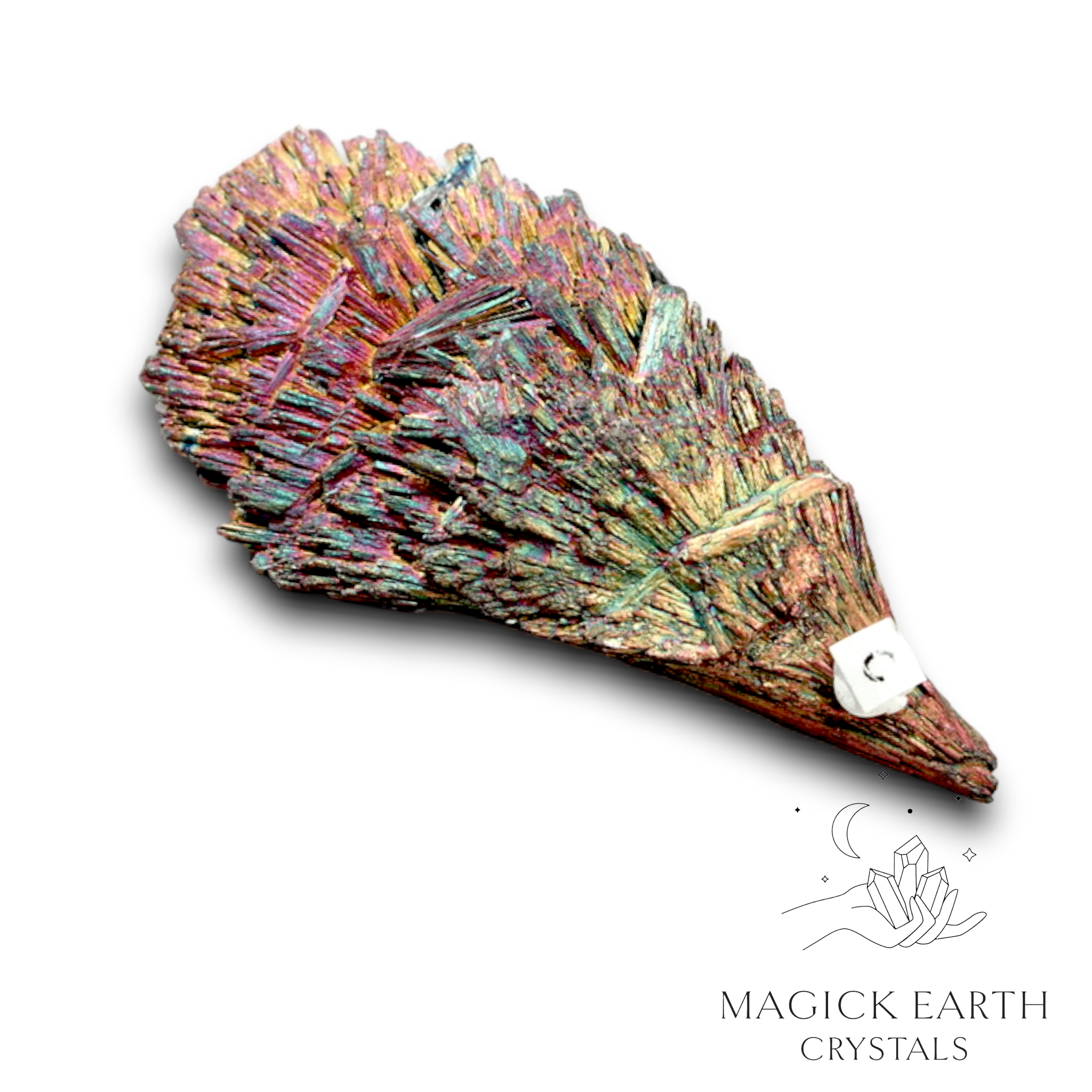 Electroplated Black Kyanite Fans combine the protective energy of kyanite with a bold metallic shimmer. Known for clearing negative energy and aligning the chakras, black kyanite is often used for cord cutting and energetic resets. The electroplated finish adds vibrant colour and makes each fan a striking piece for display, meditation, or energy work.
